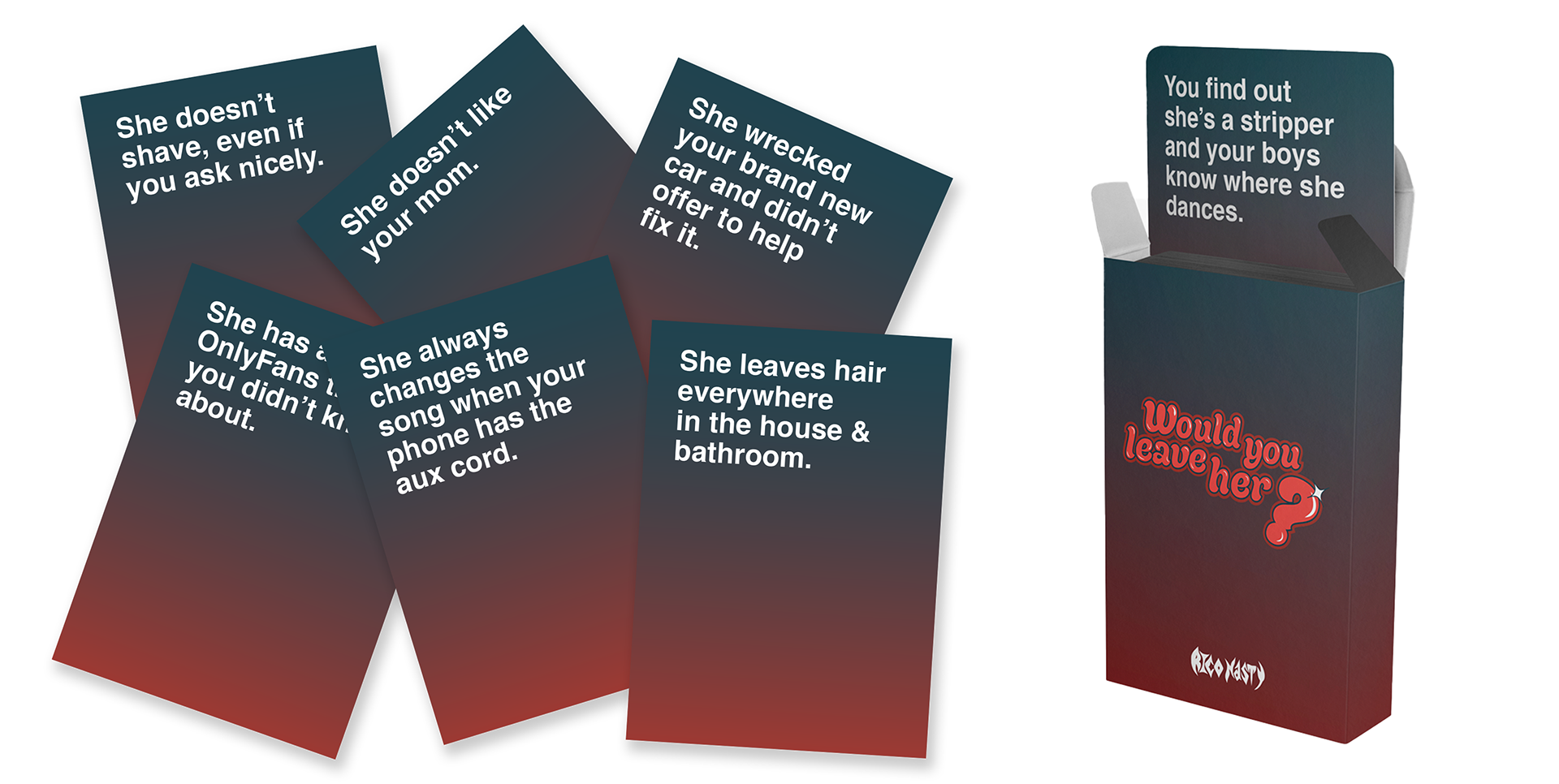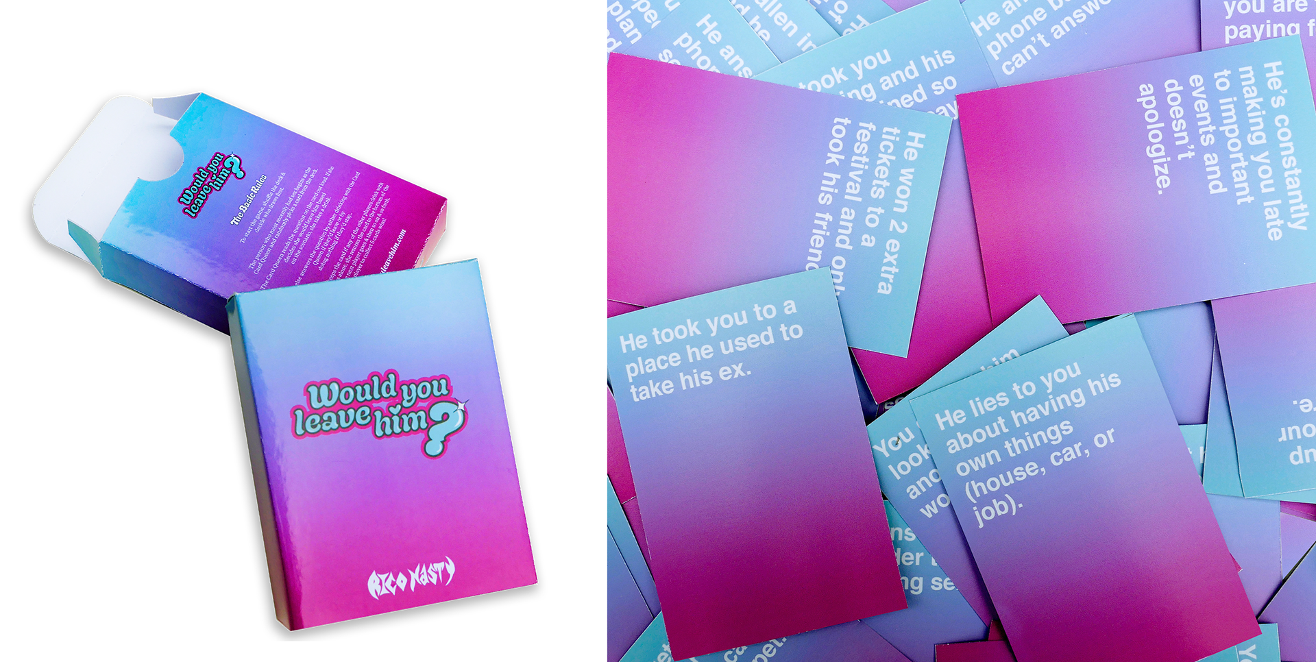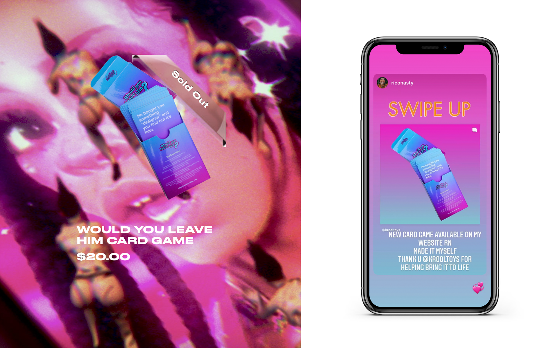 Worked with artist Rico Nasty to create a one of a kind card game called 'Would You Leave Him?' Designed and produced the game which sold out almost immediately leading to us designing another version called 'Would You Leave Her?'